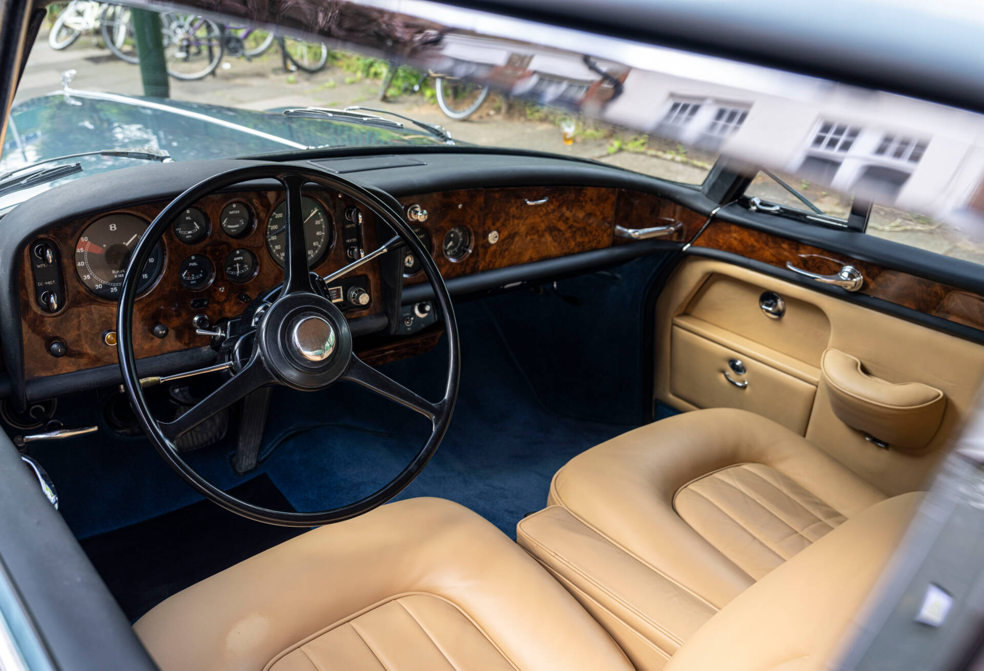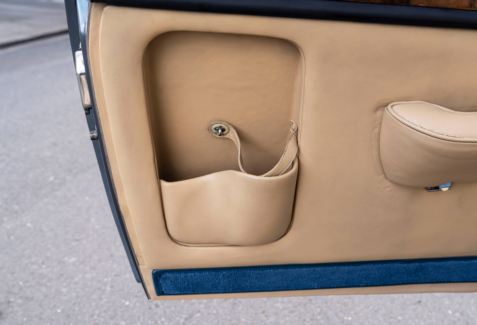 The car is painted in Steel Blue with Beige Connolly Hide interior. It has factory air-conditioning and unique door panels with drinks cabinets and “Mineral water bottle holder”.