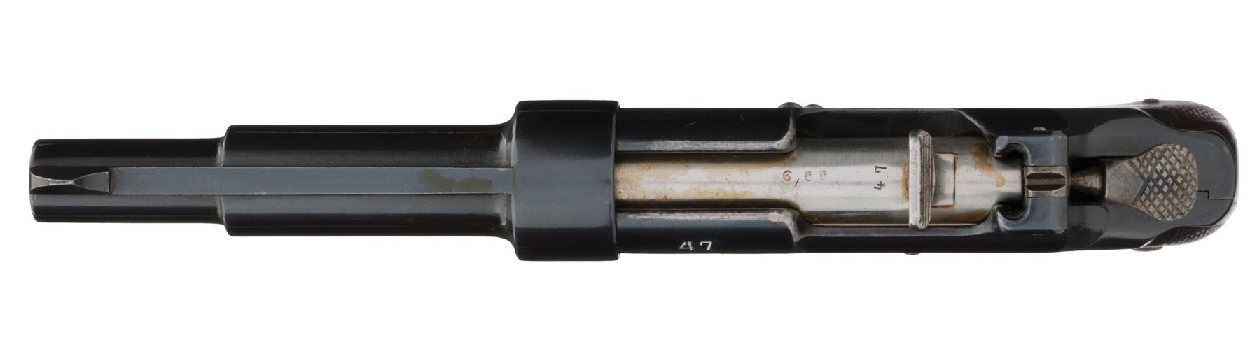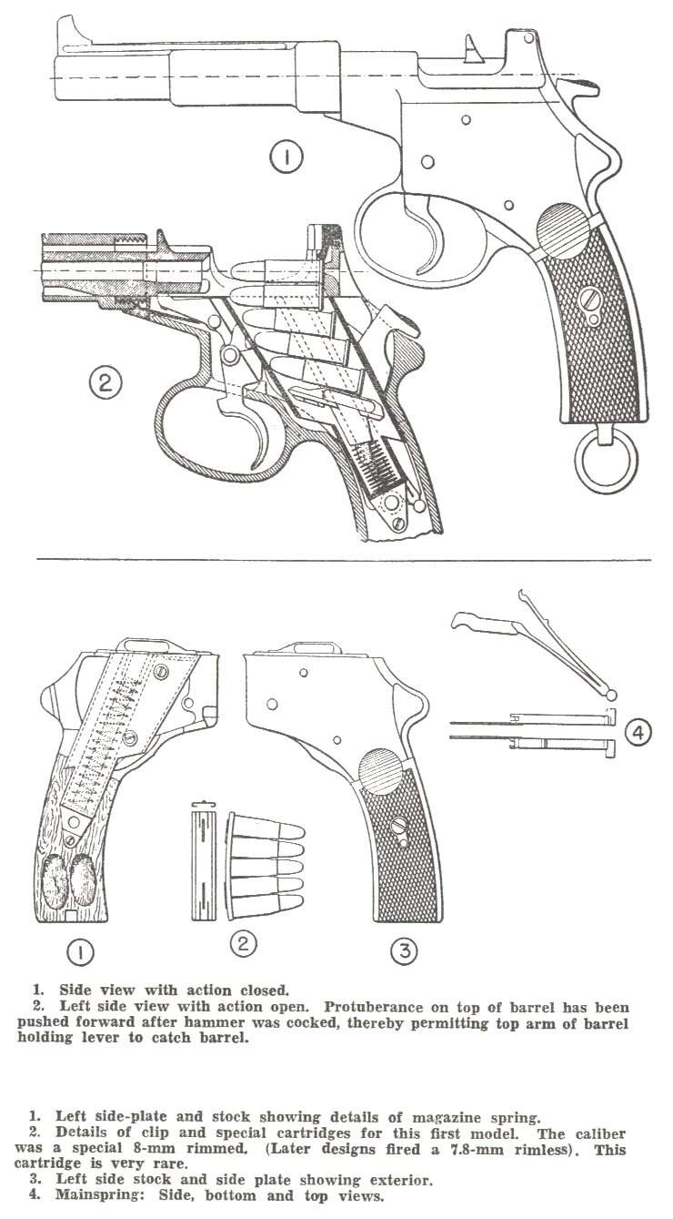 The Model 1894 was based on a blow-forward action. Very few designers tried the blow-forward style of action, one of few others to design a pistol using this style of action was the Schwarzlose.