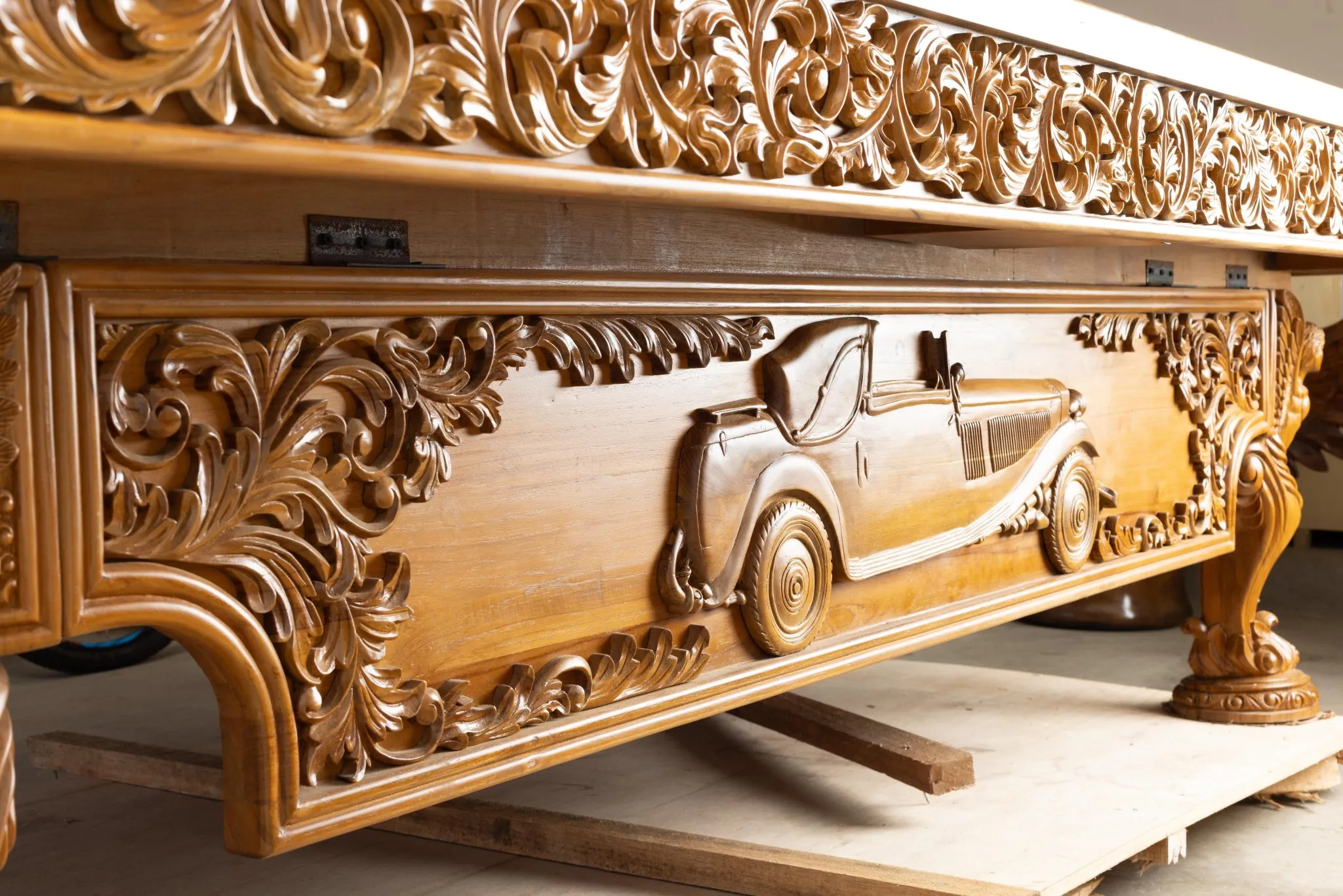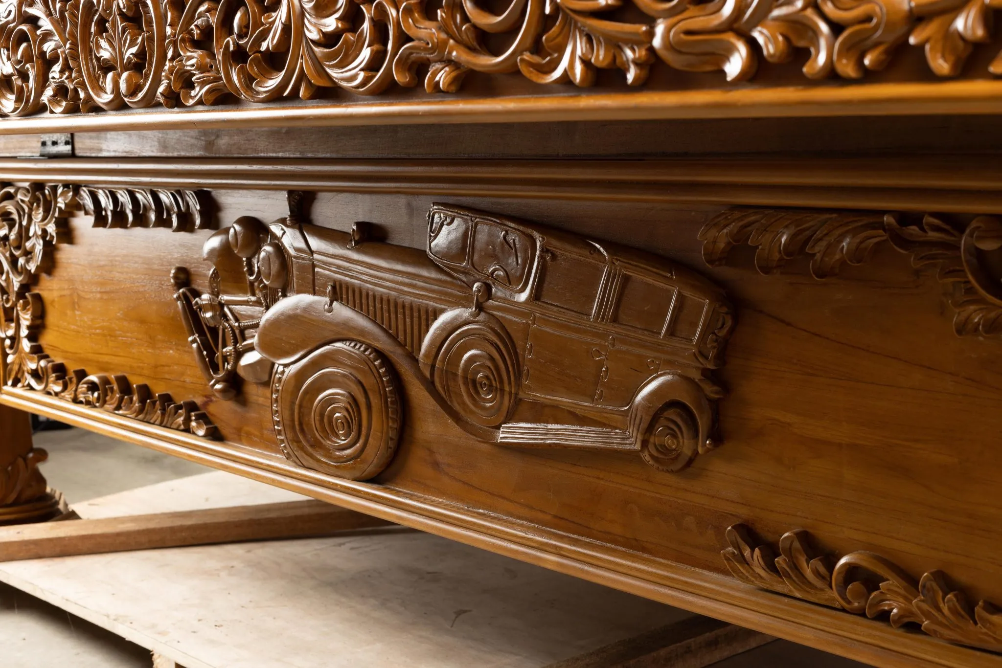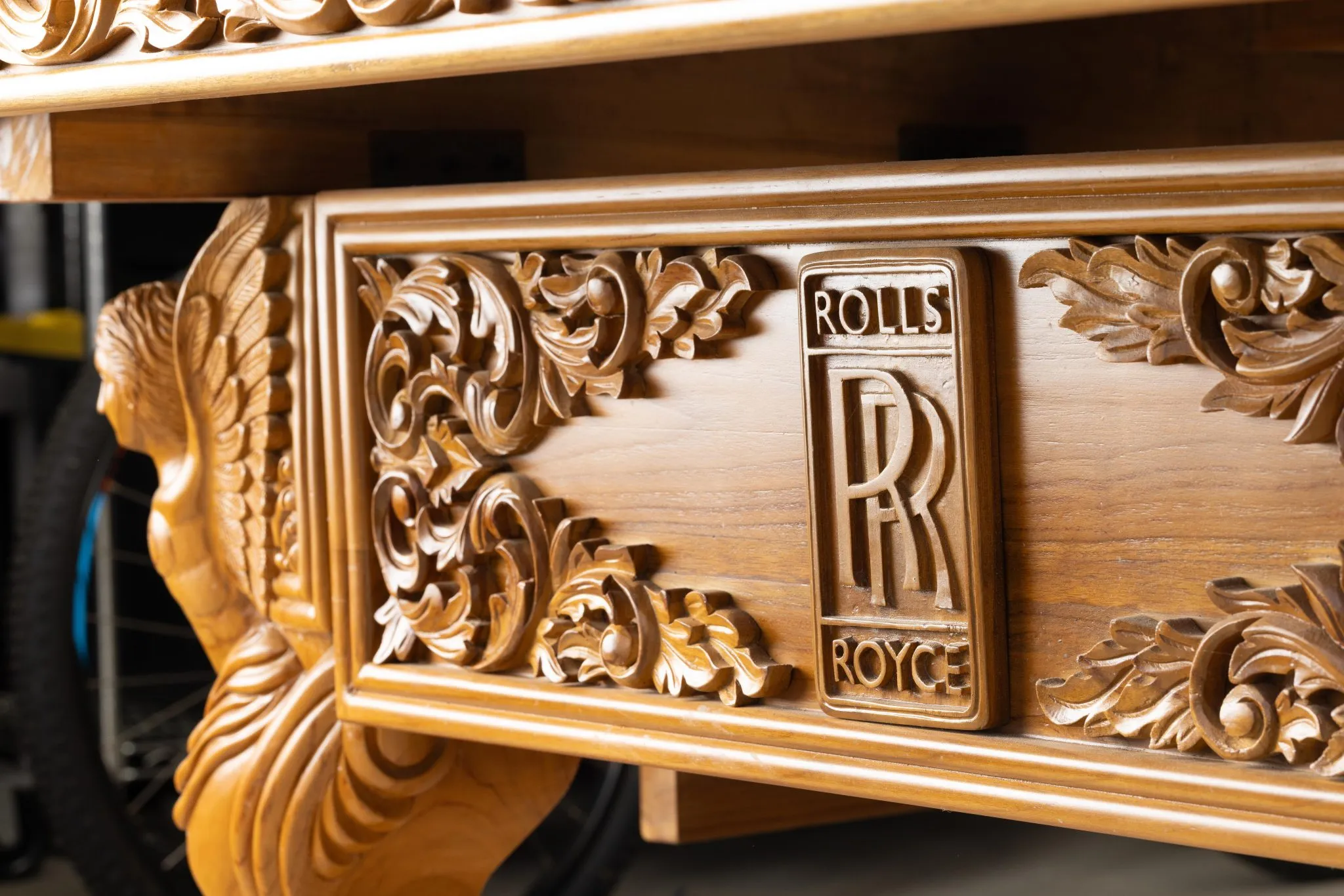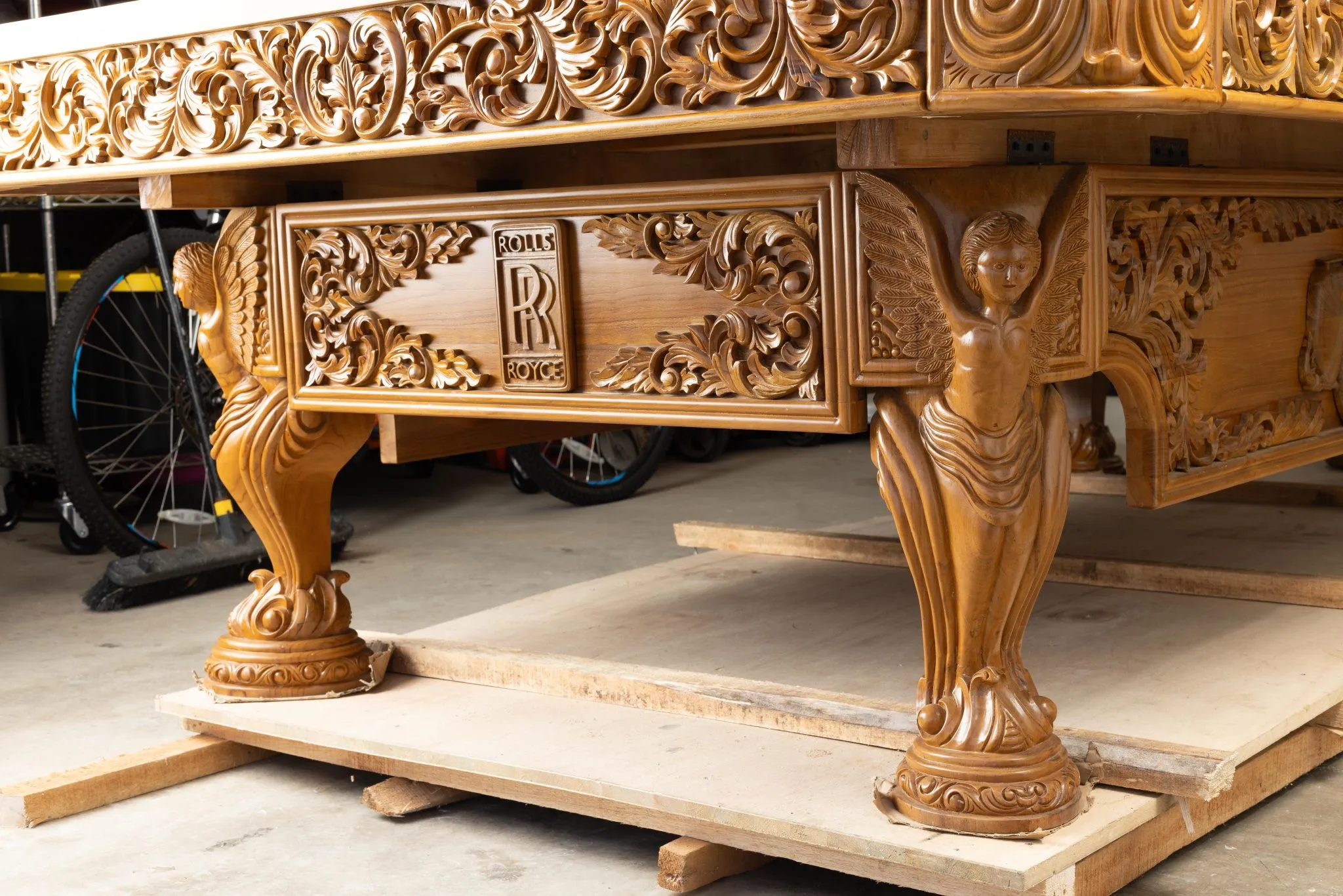 For an automobile aficionado a worthy centerpiece of a family “pool room” might just be a hand carved, teak, pool table decorated in a Rolls-Royce theme.