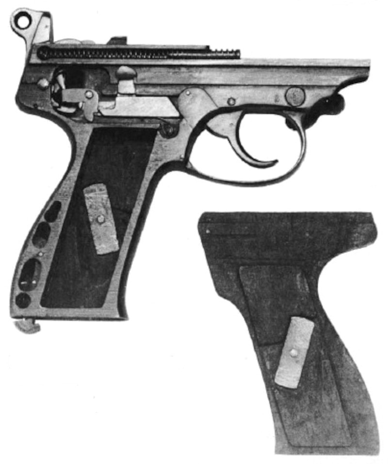 That original test pistol had a barrel length of 6 inches and a distinct overhang at the rear. This was submitted to the British military for assessment (not formal trial) and based on the military’s recommendations a second test pistol was created with the rear overhang reduced and the barrel shortened to 4.85 inches (123 mm). This next prototype incorporated a magazine safety as the assessors had requested. Its weight was 33.5 oz (empty).